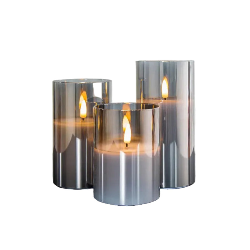 Zestaw bezpłomieniowych świec LED wykonanych z wosku i umieszczonych w eleganckich szklanych cylindrach. Emitują one ciepłe białe światło z realistycznym efektem migotania płomienia, tworząc spokojną i dekoracyjną formę oświetlenia. Idealne do codziennego użytku we wnętrzach mieszkalnych i na zadaszonych tarasach. Zestaw składa się z trzech świec o różnej wysokości, zasilanych bateryjnie.